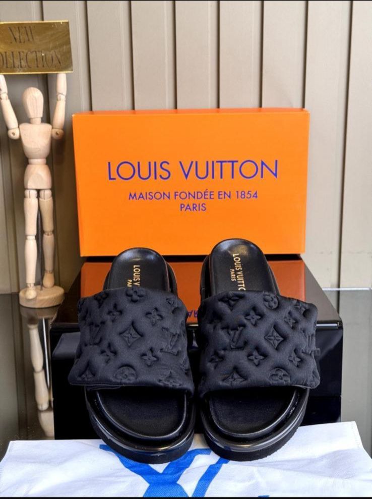 Papuci de vară unisex, moderni și comozi, realizați din materiale textile de calitate superioară. Modelul prezintă o baretă lată, matlasată, într-o nuanță elegantă de negru, cu logo-uri în relief de inspirație luxury, care adaugă un plus de stil. Talpa este groasă, ușor rotunjită, dintr-un material durabil și confortabil, ideal pentru purtări zilnice. Designul minimalist se potrivește perfect atât ținutelor casual, cât și celor streetwear.